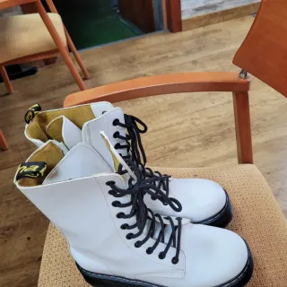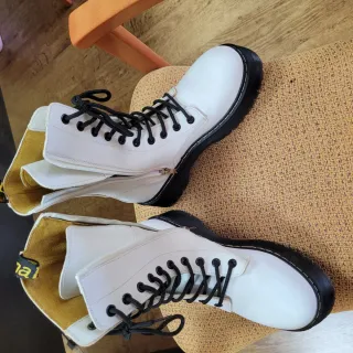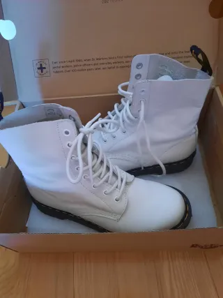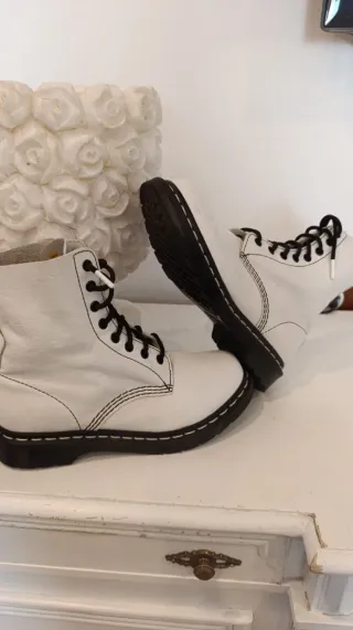 Vendo estas bonitas botas blancas estilo Dr. Martens, son la talla 40. - Diseño de caña alta. - Cierre con cordones negros. - Detalle de cremallera lateral. - Suela de goma resistente. Fueron un regalo y prácticamente no han sido usadas porque no me quedan bien, están como nuevas!!