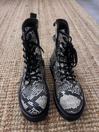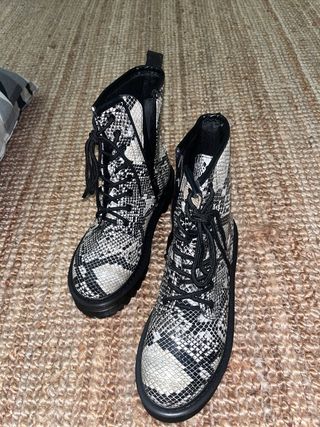 Botas de caña alta con un llamativo estampado de serpiente en blanco y negro. Cuentan con cordones y cremallera lateral para facilitar su uso. - Diseño de combate. - Suela gruesa y resistente. - Acabado imitación piel.
