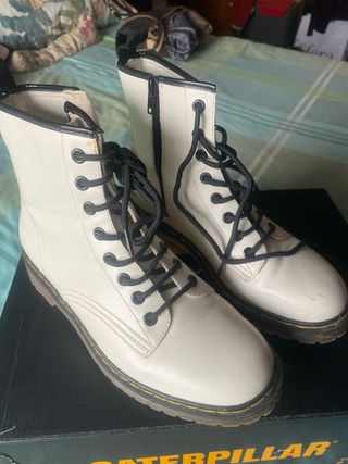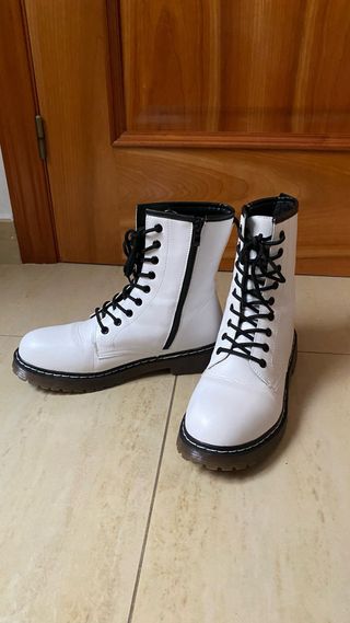 Botas de estilo militar en color blanco. Cuentan con cordones negros y cremallera lateral para facilitar su uso. - Diseño tipo Dr. Martens. - Suela gruesa y resistente. - Detalle de tira en la parte trasera. -es un 37 pero da talla