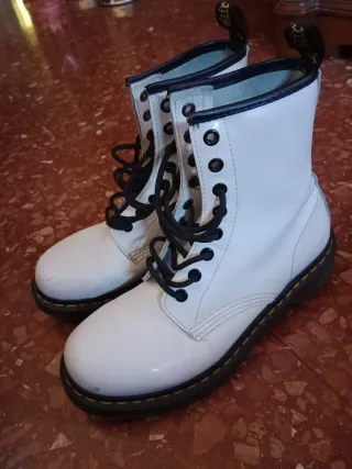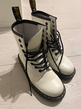 Botas icónicas de la marca Dr. Martens en color blanco. Un clásico del estilo urbano y alternativo. Estan súper nuevas casi sin usar solo hay que mirar la suela para comprobarlo. - Diseño de bota alta. - Cordones negros. - Suela de goma característica.