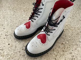 Botas de la marca Dr. Martens en edición especial. Un diseño único. Compradas en Londres. Me quedan pequeñas por lo que están en muy muy buen estado por el poco uso que han tenido. - Color blanco con detalles en rojo. - Diseño con perforaciones decorativas. - Cordones negros.