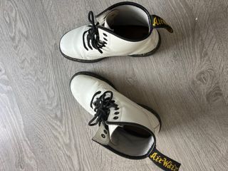Zapatos Dr. Martens de cuero blanco, talla 37. - Diseño clásico de 3 ojales. - Suela con costura amarilla. - Cordones negros.