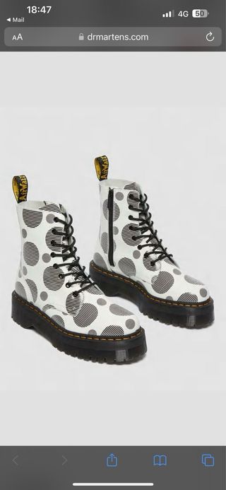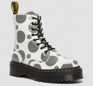 Botas Dr. Martens con un diseño llamativo de lunares. - Estampado de círculos en blanco y negro. - Suela de plataforma gruesa. - Cordones negros.