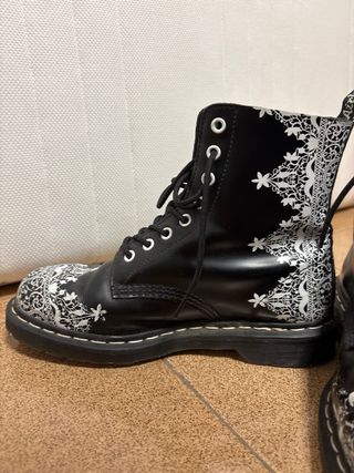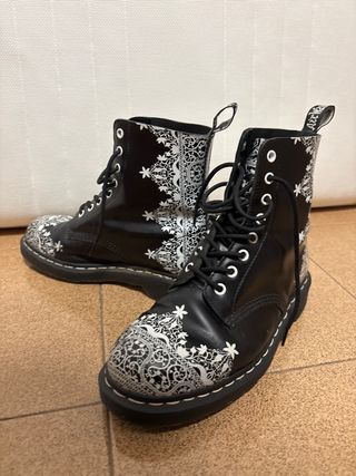 Botas Dr. Martens con un llamativo diseño de encaje en blanco sobre fondo negro. Edición limitada - Diseño de encaje y flores blancas. - Cordones negros. - Tirador trasero con logo.