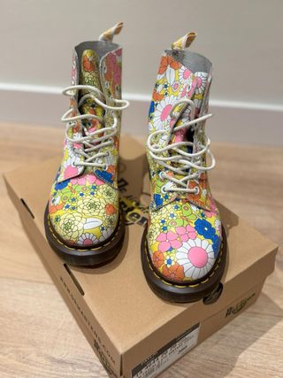 Botas icónicas Dr. Martens modelo 1460 con un vibrante estampado floral. - Diseño llamativo con flores en amarillo, rosa, azul y blanco. - Cordones blancos. - Suela negra característica.