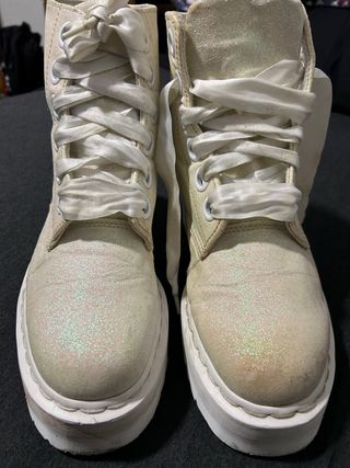 Botas Dr Martens Molly Glitter. Unisex, talla 42 (10 US/8 UK), cala alta, forro interno tipo malla blanco, piel sintética externa crema con purpurina multicolor, ojalillos extragrandes, puntadas visibles, ADN de las clásicas Docs, suela blancas tipo comando doble altura (plataformas 3.8cm de altura y 5cm del tacón) que incluye bordes estriados emblemáticos Dr. Martens con cámara de aire y resistente al aceite, la grasa, la abrasión y los resbalones. Producto con vira Goodyear. Buen estado, entrego en Valencia Centro, hago envíos.