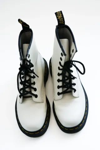 Botas estilo Dr. Martens en color blanco, talla 38. Un clásico reinventado con un acabado brillante. - Diseño de caña alta. - Cordones negros. - Suela con pespunte amarillo característico.