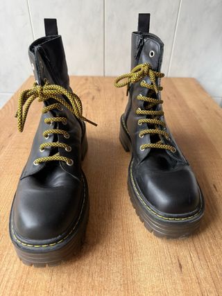 Botas de plataforma estilo Dr. Martens en color negro. - Diseño de caña alta. - Cierre con cordones y cremallera lateral. - Suela gruesa con pespuntes amarillos característicos.