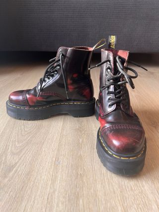 Botas Dr. Martens con plataforma y un diseño único en negro y rojo. - Detalle de costuras en contraste. - Cordones negros. - Tiradores traseros con logo. - Sin uso. - El color es como en las fotos. -Precio original: 230€