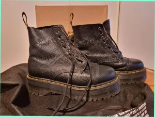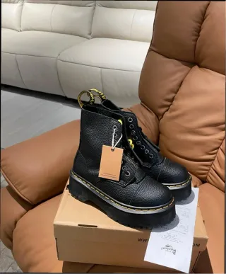 Botas Dr. Martens Jadon originales en color negro. Modelo icónico con plataforma, cordones y cremallera lateral, muy cómodas y prácticas para el día a día. Suela AirWair resistente, costuras amarillas clásicas y piel lisa en perfecto estado, sin marcas ni desgaste (ver fotos). Se entregan con su caja original. - Cremallera lateral. - Cordones. - Suela con pespunte amarillo.
