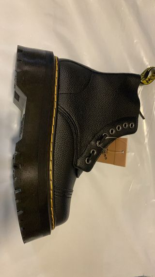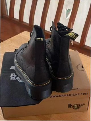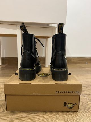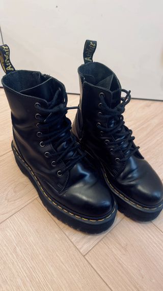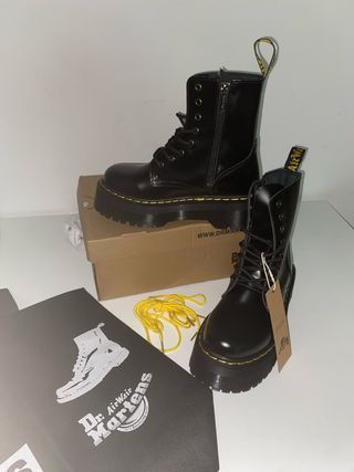Botas Dr. Martens Jadon, usadas solo una vez y en perfecto estado, como nuevas. En la foto 4, en la bota derecha, hay una rascada muy muy pequeña que casi ni se ve. Se envían en la caja original. - Modelo Jadon. - Color negro. - Cremallera lateral para fácil acceso. - Suela plataforma icónica. - Cordones negros. - Tirador trasero con logo. - Costuras amarillas características.