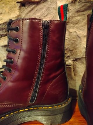 Botas de estilo robusto en color granate. - Diseño de caña alta. - Cierre con cordones y cremallera lateral. - Suela gruesa con plataforma. - Detalle de costuras amarillas en la suela. Solo se han usado una vez para probarlas.