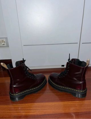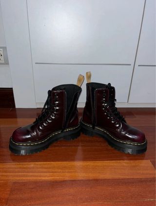 Dr. Martens Jadon Arcadia – Cherry Red (Rojo Cereza) Talla: EU 38 (UK 5 · US 7) Estado: Muy buen estado. Usadas 2 veces, sin daños ni rozaduras. • Cuero Arcadia: acabado “rub-off” con brillo rojizo que se intensifica con el uso. • Suela AirWair de plataforma gruesa y costuras amarillas características. • Cremallera lateral funcional y cordones originales. • Sin caja original, pero se entregan perfectamente limpias.
