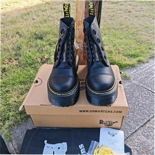 Botas de plataforma Dr. Martens con un diseño moderno y atrevido. Perfectas para añadir un toque de estilo a cualquier atuendo. - Acabado en piel texturizada. - Suela gruesa de goma. - Cierre con cordones y cremallera lateral. - Detalle de costuras amarillas. - Incluye caja original y bolsa de tela.