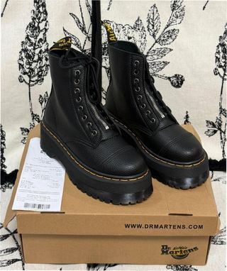 Botas Dr. Martens con cremallera frontal y plataforma. - Diseño moderno y llamativo. - Suela gruesa con distintivo ribete amarillo.