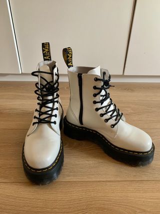 Botas Dr Martens color blanco con plataforma. Modelo Jadon. Apenas un par de usos, vendo porque me quedan grandes. Cremallera lateral para ponértelas en un pispás. Si te fijas muy de cerca tienen un pequeño rayón en el lado interior de la bota izquierda, pero apenas se aprecia a simple vista (última foto). Aparte de eso están impecables. Para pisar fuerte y con estilo 😎