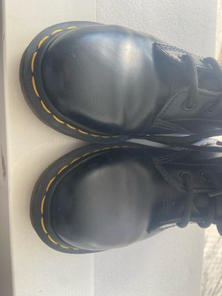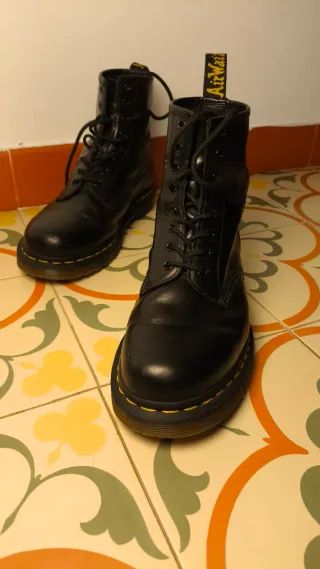 Botas icónicas de la marca Dr. Martens en color negro. - Diseño clásico de 8 ojales. - Costuras amarillas distintivas en la suela. - Fabricadas en cuero. - Suela con cámara de aire. Casi sin uso, ya que me van pequeñas
