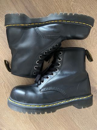 Botas Dr. Martens en color negro. Un clásico para cualquier ocasión. Muy fuertes. Son unas Dr. Martens Made in England. Son únicas y difíciles de encontrar. Mira la suela. - Material exterior de cuero. - Suela de goma con pespuntes amarillos característicos. - Cierre con cordones.