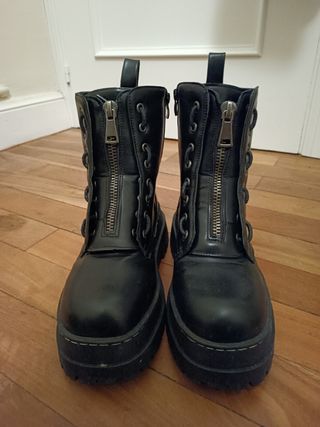 Botas de estilo militar en color negro. Cuentan con cierre de cordones y cremallera lateral. Estilo martens Talla 36 pero calza pequeña 35/36 Utilizadas 2 veces - Diseño de caña alta. - Suela gruesa y resistente. - Tirador trasero para facilitar su puesta.