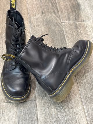Botas icónicas de la marca Dr. Martens en color negro. Un clásico del calzado con un diseño atemporal. - Material exterior de cuero texturizado. - Cordones negros para un ajuste seguro. - Suela con distintivo pespunte amarillo. Están en perfecto estado, puestas literalmente una vez y son pequeñas para mí.