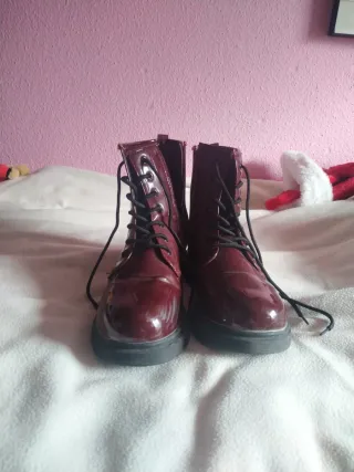Botas de caña alta con un acabado brillante en color burdeos. - Cierre de cordones. - Cremallera lateral para facilitar su uso. - Suela gruesa y resistente.