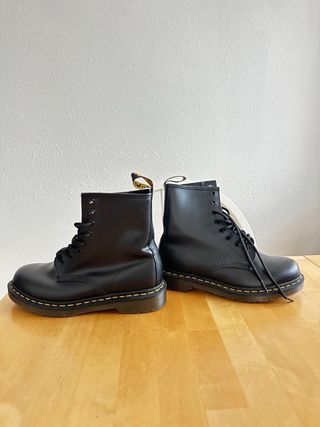 Botas Dr. Martens en color negro, en excelente estado. - Diseño clásico de 8 ojales. - Parte superior de piel lisa. - Suela con distintivo pespunte amarillo.