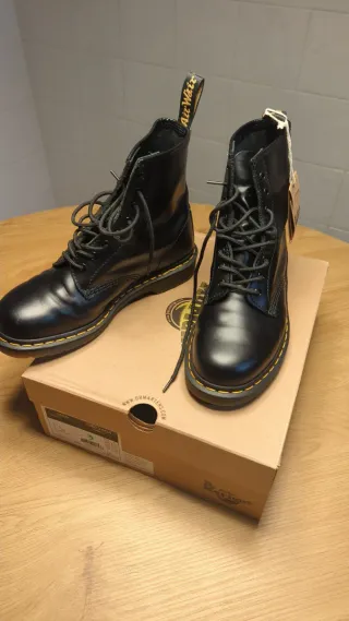 Botas de estilo militar unisex, inspiradas en el diseño clásico de Martens. Perfectas para un look urbano y moderno. El dueño se las puso una vez y le venían justas de talla. No se han vuelto a usar más. - Cierre con cordones. - Diseño de caña alta. - Suela gruesa y resistente.