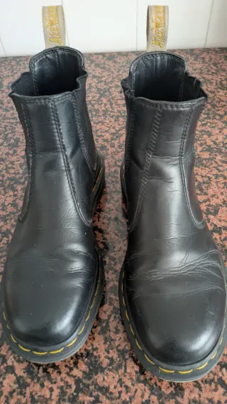 Botas estilo Chelsea de Dr. Martens en color negro. Un clásico versátil para cualquier ocasión. Precio relativamente negociable. - Diseño Chelsea con elásticos laterales. - Tirador trasero para facilitar el calce. - Costuras amarillas características en la suela.