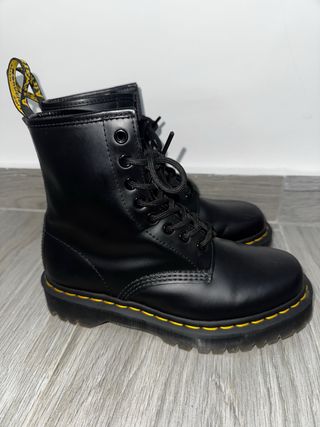 Botas Dr. Martens en color negro, casi nuevas y en excelente estado. Son muy cómodas y resistentes. - Modelo clásico de caña alta. - Suela con el característico pespunte amarillo. - Cierre con cordones - Talla 43
