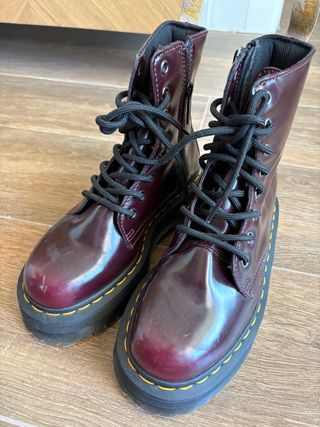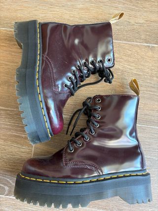 Botas Dr. Martens de plataforma, talla 37 EU, color burdeos. Están en muy buen estado, con un diseño impecable. Único defecto un pequeño arañazo en la punta de la bota derecha. - Material: cuero vegano - Suela gruesa y muy resistente - Cordones negros se han utilizado dos veces, las vendo porque a mi novia le quedan estrechas