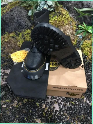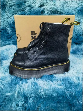 Botas estilo plataforma Dr. Martens Jadon. - Material de cuero texturizado. - Suela gruesa y robusta. - Ojales metálicos para los cordones. - Tirador trasero característico.