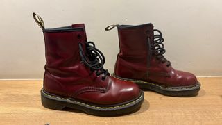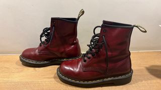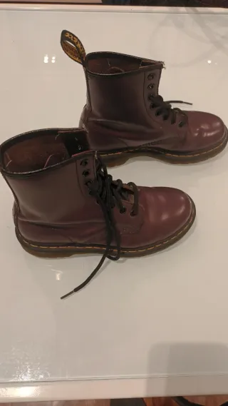 Botas Dr. Martens de color granate. Se encuentran prácticamente nuevas. - Modelo clásico de caña alta. - Cordones negros. - Tirador trasero con logo.
