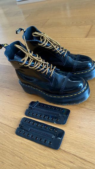 Botas Dr. Martens charol brillante negro con detalles arcoíris. - con plataforma plana Sinclair - se pueden llevar con cremallera o con cordones - Nuevas: 245€ - Incluye cordones y cremallera utilizadas una par de veces