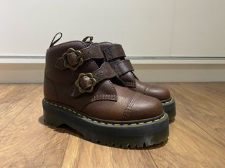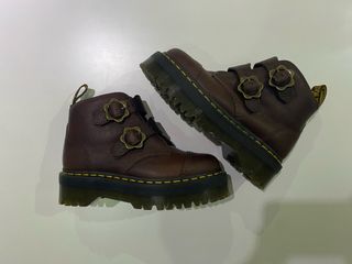Botas estilo botín de Dr. Martens en color marrón. Presentan un diseño con doble correa y hebillas en forma de flor. - Material de cuero texturizado. - Suela gruesa con plataforma. - Cierre de hebilla. - Detalle de costura amarilla en la suela.