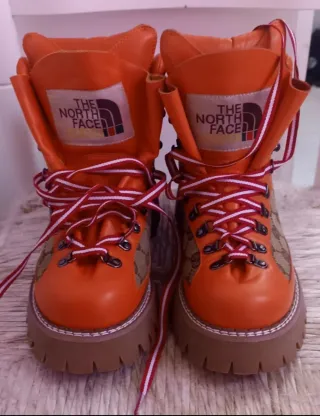 Botas de montaña de la colaboración entre Gucci y The North Face. - Diseño en color naranja vibrante. - Panel lateral con el monograma GG de Gucci. - Detalle del logo The North Face Gucci en la lengüeta y el lateral. - Cordones a contraste en rojo y blanco. - Suela gruesa y robusta. En perfecto estado, estan sin estrenar