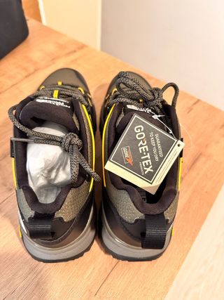 Zapatillas de senderismo The North Face en talla 43. Combinan tonos oscuros con detalles vibrantes. - Diseño con paneles de malla y ante. - Tiras de refuerzo en color amarillo. - Membrana GORE-TEX para impermeabilidad.