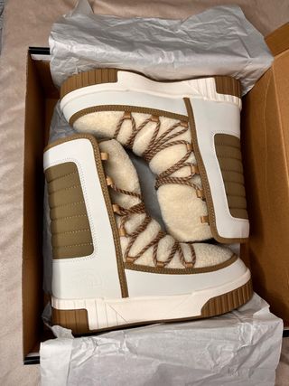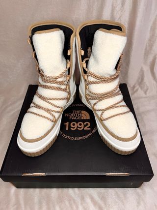 Botas de invierno The North Face con un diseño moderno y cálido. - Exterior blanco con detalles en marrón. - Forro interior de borreguito. - Cordones marrones para un ajuste seguro. - Suela gruesa y resistente. Tallas disponible: 36 y 38