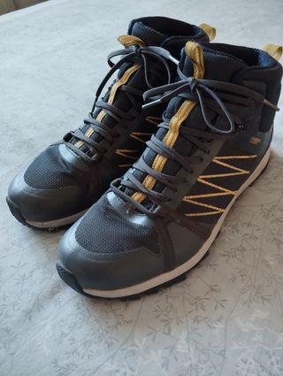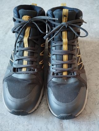 Zapatillas de montaña THE NORTH FACE, talla 42. Son de color negro y verde oliva. Están en buen estado, con ligeras señales de uso. - Cómodas y resistentes. - Ideales para senderismo.