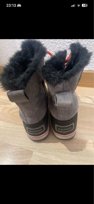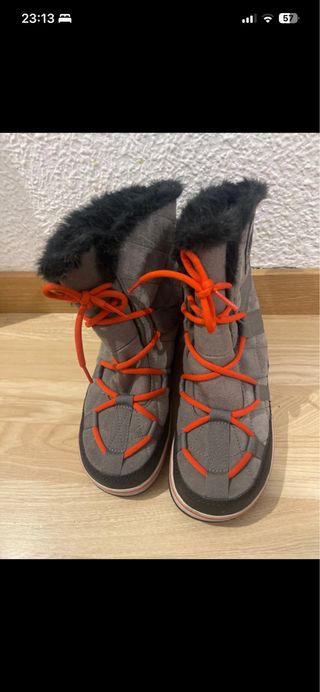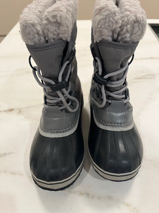 Botas de nieve Sorel en color gris, como nuevas. - Diseño impermeable. - Forro interior de pelo sintético para mayor calidez. - Cierre con cordones para un ajuste seguro. - Suela de goma resistente.