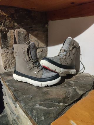 Botas impermeables de la marca Sorel. Tan solo tienen dos puestas. Estan nuevas. - Combinación de materiales en tonos marrones y grises. - Cierre con cordones rojos. - Diseño de caña media.