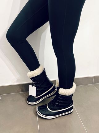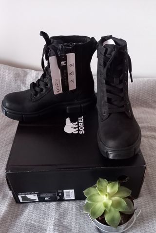 Botas de invierno Sorel en color negro, con un diseño moderno y cálido. Incluye un neceser de Woman Secret. IMPORTANTE más adecuado para un 36.5, talla pequeño. Son de piel e impermeable - Forro interior de pelo sintético. - Cordones blancos. - Suela gruesa y dentada.
