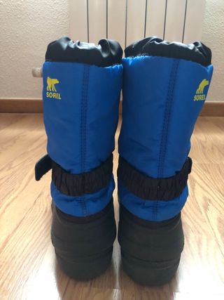 Botas de nieve Sorel en color azul y negro, talla 38. Perfectas para mantener los pies calientes y secos en climas fríos. - Diseño con forro interior de borrego. - Cierre con cordones y ojales. - Suela de goma antideslizante.