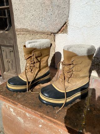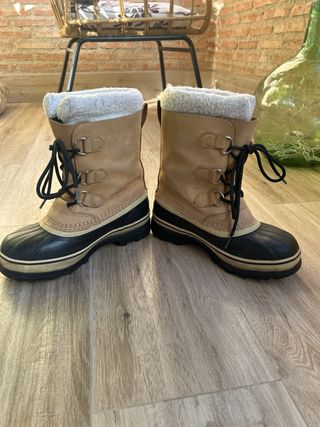 Botas de invierno Sorel Caribou, perfectas para mantener los pies secos y calientes. - Diseño impermeable. - Forro interior de pelo. - Cordones negros. - Suela de goma negra y beige. Tienen la goma un poco desgastada en un pie fruto de uso.
