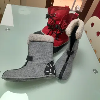 Botas de nieve unisex con un diseño moderno y funcional. . Empeine: tejido sintético revestido de PU con resistencia duradera al agua y al viento. Polaina integrada con cierre de tanca y cinta elástica fija en el empeine. . Aislamiento: forro de fieltro reciclado, lavable y amovible de 6 mm. Mediasuela: inserto antihelada de fieltro adherido de 2,5 mm. . Suela: exterior de caucho térmico impermeable moldeado por inyección con tacos multidireccionales para mayor tracción. Apenas una semana de uso NO SE HACEN ENVÍOS ENTREGA EN LA CORREDORIA