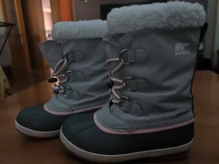 Botas de invierno Sorel Yoot Pac para niños, ideales para mantener los pies calientes y secos. - Diseño unisex. - Combinación de colores gris y rosa. - Materiales resistentes e impermeables. Botas usadas pero en buen estado
