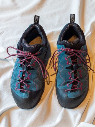 Zapatillas de trekking MONTURA para mujer, en azul y rosa. Modelo Yura. Con Goretex. Muy poco uso. Con plantillas originales y nuevas. Dos juegos de cordones. Se envía en su embalaje original y etiquetas originales. Precio original, 169 euros. Compradas en Barrabés. Están en Huesca capital. Las vendo porque no me entra el pie con mis plantillas ortopédicas