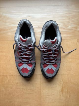 Zapatillas de trekking Boreal en tonos grises y rojos. Perfectas para tus aventuras al aire libre. - Diseño deportivo y resistente. - Cierre con cordones. - Detalle de logo en el lateral. - Talla 44 - Tienen cierto uso pero se ven bastante bien. - Se entrega en mano en Madrid