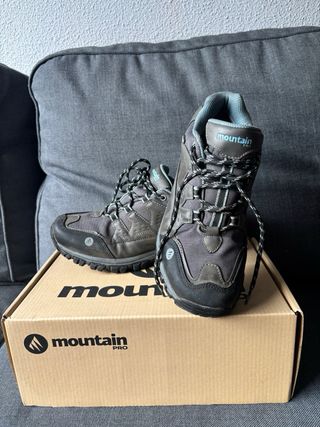 Zapatillas de trekking talla 35. Diseñadas para ofrecer comodidad y soporte en tus aventuras al aire libre. - Combinación de colores gris y rosa. - Cierre con cordones para un ajuste seguro. - Caña media para mayor protección del tobillo. Usadas tres horas. En perfecto estado. Higienizadas.
