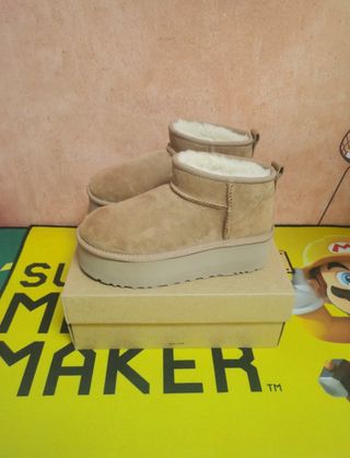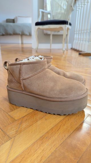 Botas UGG modelo Ultra Mini con plataforma en color arena. Talla 39. - Fabricadas con materiales de primera calidad. - Diseño cómodo y lujoso. - Cuidado especial: evitar el uso en condiciones climáticas adversas para prevenir daños.