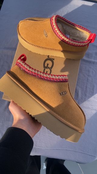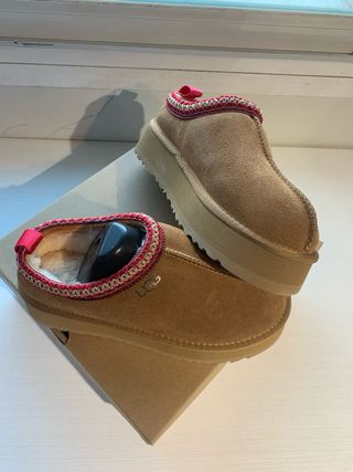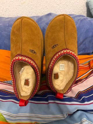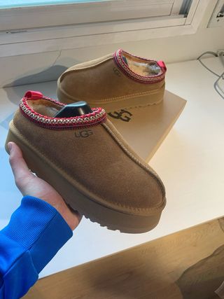 Pantuflas UGG Tazz en color marrón. Perfectas para estar cómodo en casa. Botas estilo australiano , confeccionadas en ante suave con interior completamente forrado de pelo para máximo abrigo y comodidad. Diseño clásico de caña media, muy fáciles de combinar en looks de otoño e invierno. Suela resistente y flexible para uso diario. envio en 24h Estado: Nuevas, sin uso, con caja. Súper cómodas y calentitas. Talla: 39 y 38 en perfecto estado. Si necesitas medidas exactas o más fotos, puedo facilitarlas. Entrega mano disponible tambien - Exterior de ante. - Forro de lana de oveja. - Suela de plataforma. - Detalle de borde tejido.